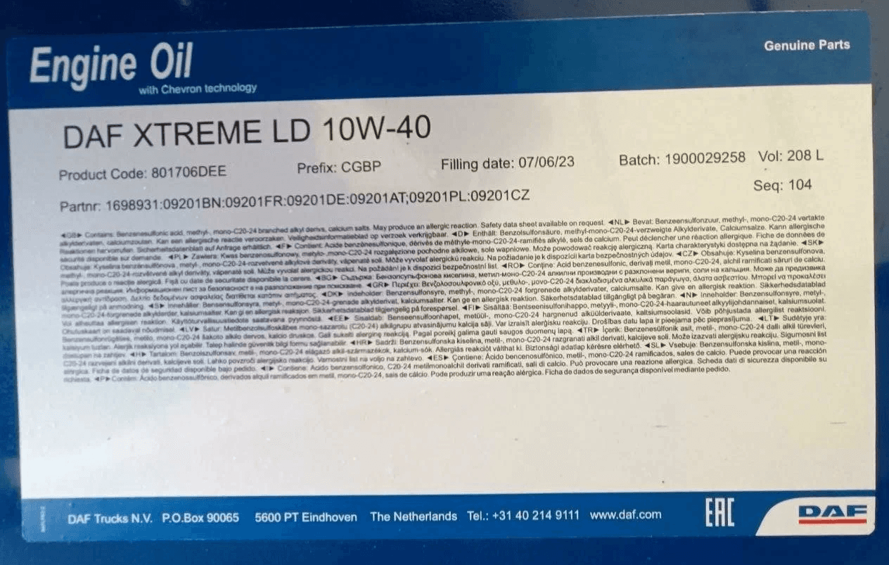 801706DEE DAF Xtreme LD Моторное масло 10w-40 (бочка 208л) (Бельгия)