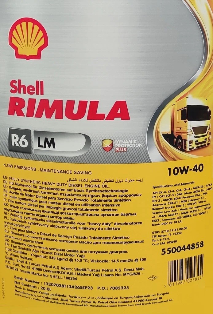 550044858 RIMULA R6 LM Моторное масло 10w-40 (канистра 20л) SHELL Синтетическое моторное масло - полностью синтетическое моторное масло для тяжелонагруженных дизельных и газовых двигателей. Данный продукт произведен с использованием пакета присадок «Low SAPS». Использование этого масла также позволяет увеличить межинтервальные пробеги двигателя. Shell Rimula R6 LM 10W-40 рекомендовано для применения в двигателях, соответствующих самым современным экологическим стандартом Евро 4, 5, 6, оснащенных последними системами доочистки выхлопных газов, такими как сажевый фильтр (DPF) и системы селективной каталитической нейтрализации (SCR). API CJ-4, CI-4, CH-4, CG-4, CF-4, CF Caterpillar ECF-3 Cummins CES 20081 Соответствует DAF ACEA E6 Deutz DQC IV-10 LA IVECO NG2 (отвечает требованиям) JASO DH-2 Mack EO-O Premium Plus MAN M3477, M3271-1 MB 228.51 MTU Category 3.1 Renault Trucks RLD-3 Volvo VDS-4 Scania Low Ash |
